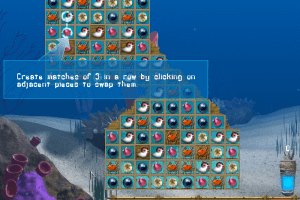 The gameplay revolves around a matching puzzle format where players swap adjacent sea-themed tiles to create chains of three or more of the same type. The goal is to clear the board and uncover hidden treasures scattered throughout various reef environments. Each level offers a unique challenge, testing both speed and strategy.
