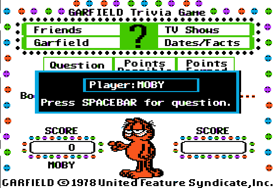 The game allows players to answer trivia questions in a multiple-choice format. Each question is accompanied by colorful graphics and features everyone’s favorite lazy cat, Garfield, as a central element. The objective is to answer correctly to earn points, with Garfield providing witty commentary that adds to the entertainment value.