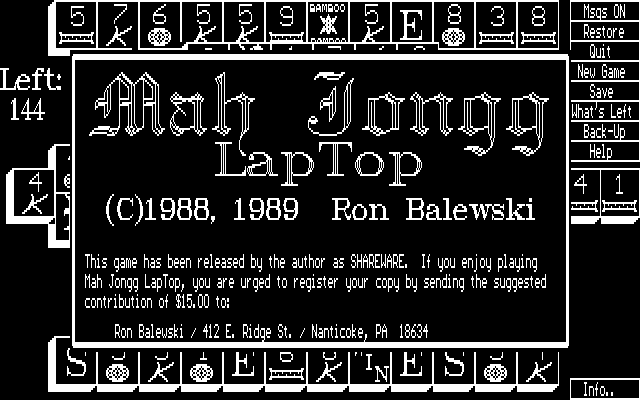 Released in 1989, this version of Mah Jongg provides players with a digital adaptation of the classic Chinese tile-matching game. The game was designed to be played on laptops, making it one of the early adaptations aimed at utilizing the portability of personal computers of that era.