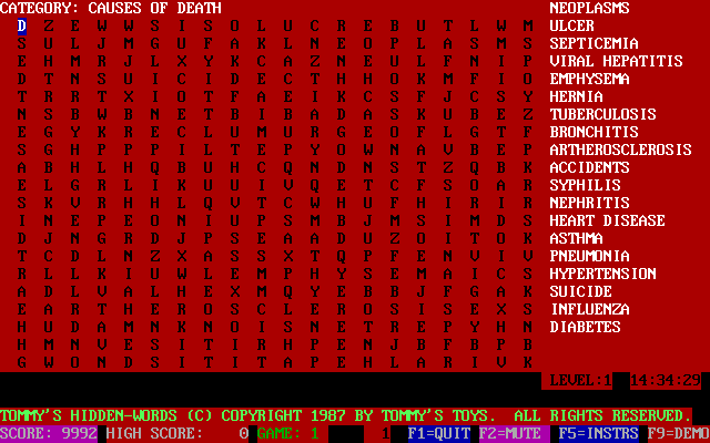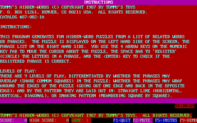 This game is a classic puzzle experience from the late 1980s, focusing on word discovery and brain-teasing challenges. Developed by Tommy’s Toys, a lesser-known developer of the time, the game requires players to find hidden words from a jumbled grid of letters. This concept is similar to the word search puzzles found in magazines but brought to the digital format.