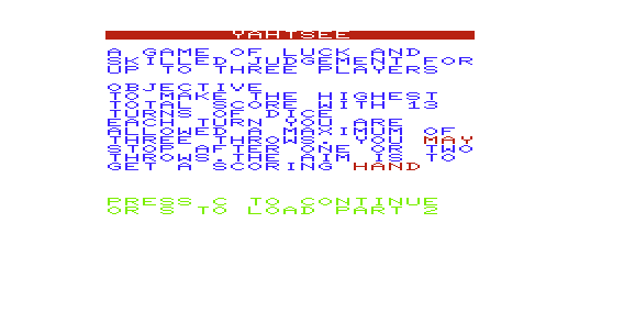 The game released in 1985 is a digital adaptation of the classic dice game known for its blend of chance and strategy. Players roll five dice and attempt to achieve specific combinations to score points. The objective is to maximize the score over thirteen rounds.