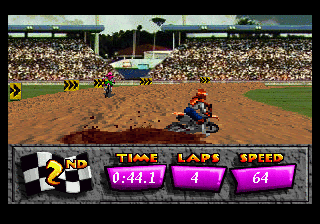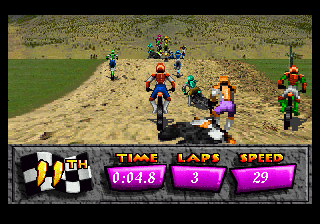 With its pixelated graphics typical of the mid-90s gaming era, the game focuses more on delivering fast-paced action rather than visual finesse. The sound design complements the racing atmosphere with revving engine sounds and satisfyingly noisy jumps.