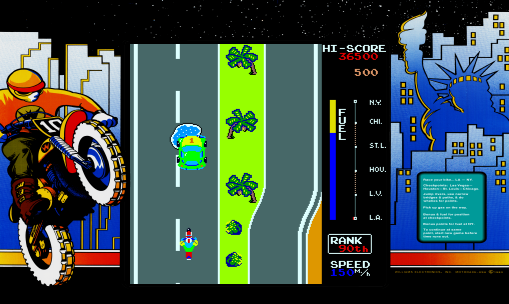 Released in 1983 and developed by Irem Corp., this arcade-style video game challenges players with an exciting cross-country motorbike race across the United States. The objective is straightforward: navigate through a series of checkpoints and reach the final destination while overcoming obstacles and other competitive racers.