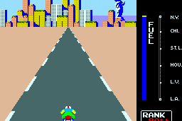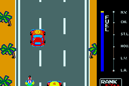 The game features a top-down perspective and a simple control scheme. Players must dodge cars and other hazards on the road, while maintaining fuel levels and avoiding crashes. The racer must interact skillfully with traffic and road layouts to ensure progress through each level.