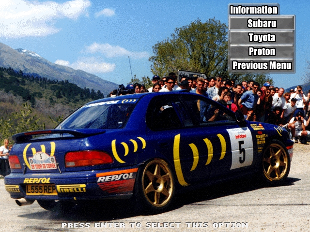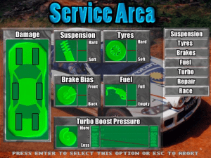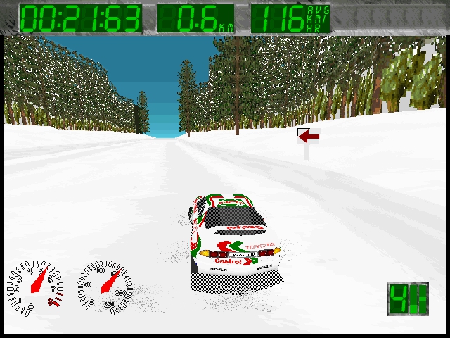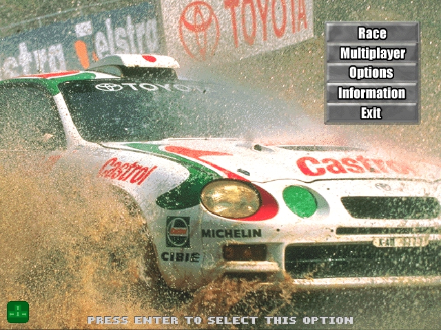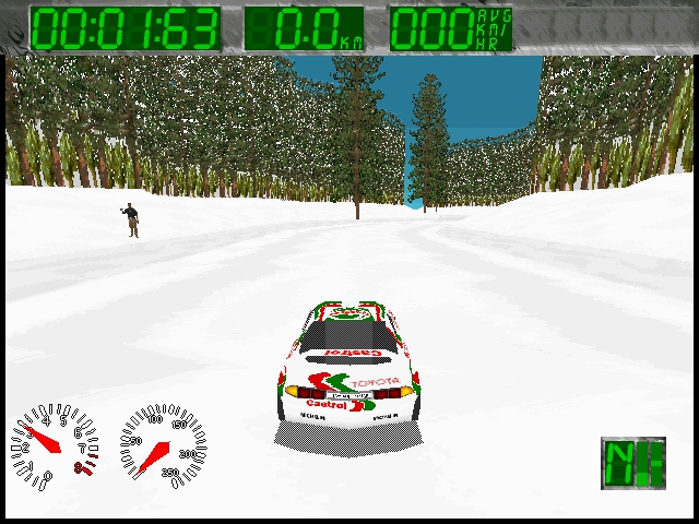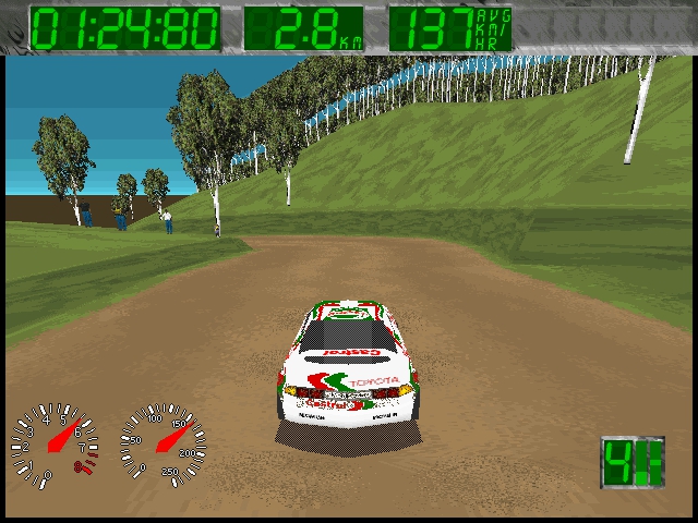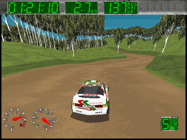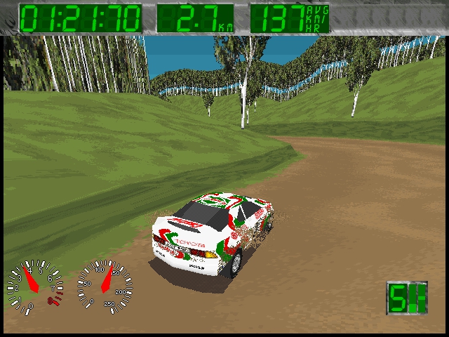 The game features graphics that were considered impressive for its time, with detailed car models and well-designed tracks. The sound design complements the visual elements, creating an engaging racing atmosphere. Engine roars and tire screeches contribute to an authentic rally experience.