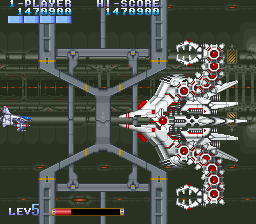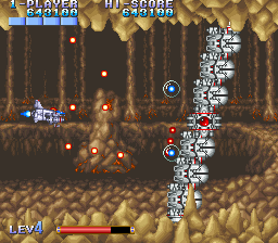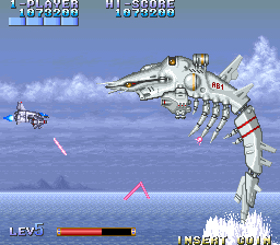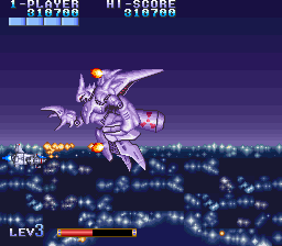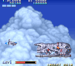 The game features intense arcade-style gameplay, typical of the era, where players control a fighter craft with the ability to upgrade weapons. The primary goal is to navigate through various stages, each filled with enemy ships and obstacles, ultimately facing off against a boss at the end of each level. The upgrade system allows players to choose different weapons forms, adding a layer of strategy to the action-packed gameplay.