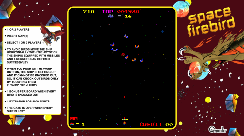 Released in 1980, this arcade game challenges players to control a spaceship defending against successive waves of enemy birds that descend from the top of the screen. Players must shoot down the enemies to gain points while avoiding collision with them and their projectiles.