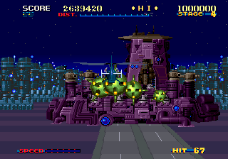 The game combines both top-down and third-person perspectives, giving players a dynamic experience as they navigate through enemy territory. The top-down view is used for navigating cityscapes while the third-person perspective takes the player through canyon runs, blending both aerial and ground-based combat. Players must dodge obstacles and enemy fire while destroying opponents to progress through the game.