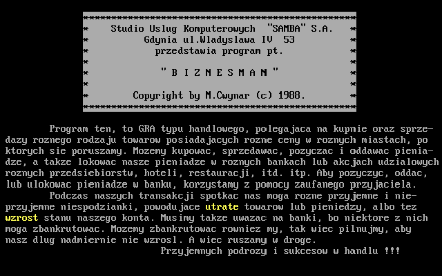 Biznesman is a classic simulation and strategy game from the late 1980s. Embark on a captivating journey of entrepreneurship, where players are challenged to build their own business empire from the ground up. The game invites players into a digital world where financial acuity, strategic planning, and smart investments are paramount.