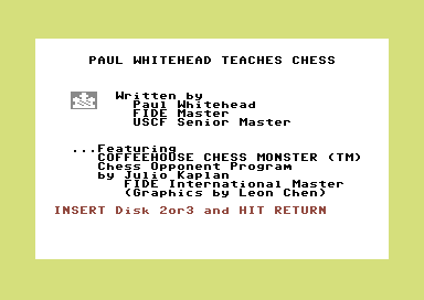Paul Whitehead Teaches Chess is a classic chess educational game released in 1985. This game was developed by Julio Kaplan, who sought to blend educational content with interactive gameplay to teach chess concepts effectively. It’s an early example of software aimed at improving players’ skills through structured lessons and exercises.