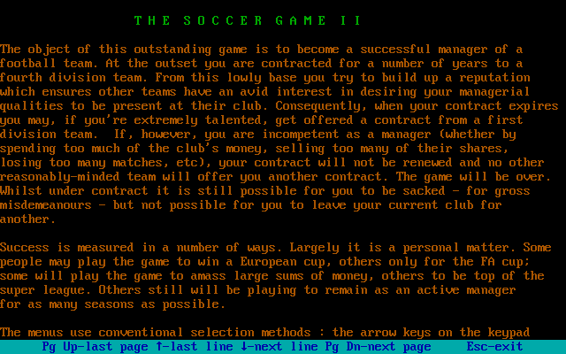 The Soccer Game II is a sports simulation video game developed by New Era Software and released in 1990. It offers players an engaging football experience with a focus on realistic gameplay and team management. As a sequel to its predecessor, it aimed to enhance various aspects of the original game, providing improved graphics and smoother mechanics.