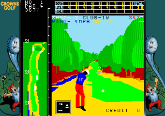 The graphics are typical for the early 1980s arcade-style games, with simple yet vibrant colors that represent the golf courses, players, and environments. Sound effects are minimal but effective, providing feedback after each swing and as the ball travels across the course.