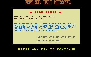While England Team Manager may not be as well-known today, it was one of the early attempts to bring the excitement of football management to home computers. The game appealed to football enthusiasts eager for a chance to simulate managing a national team, offering an engaging experience within the technical limitations of the era.