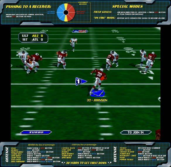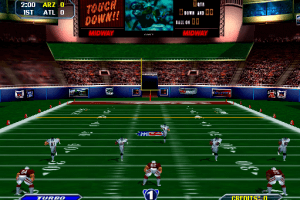 The game stood out for its vibrant, colorful graphics and fluid animations, which captured the intensity of the sport in a way no other football game had at the time. Accompanied by a dynamic soundtrack and energetic announcers, the atmosphere is electrifying, capturing the excitement of an NFL game with a wild, arcade twist.