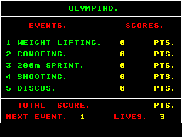 Players participate in a variety of sports disciplines that are reminiscent of Olympic events. The game often requires quick reflexes and precise timing, typical of early sports simulations. Competitions can include track and field events, swimming, and other athletic pursuits. Each event offers a unique set of controls and mechanics, demanding players to adapt their strategy and skills accordingly.