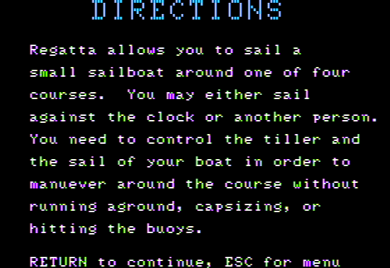 Released in 1983, Regatta: A Sailing Game offers players a unique experience that simulates the art and science of sailing. This classic title was designed for early personal computers, capturing the essence of competitive regattas through careful navigation and strategic decision-making.