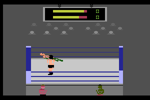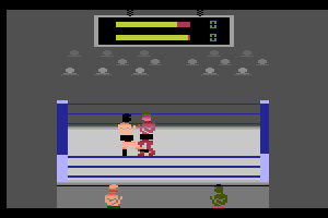Given the limitations of the technology at the time, the visuals are simple but functional. The audience and wrestling ring are rendered in basic pixel graphics typical of the 8-bit era. Audio includes basic sound effects to accompany the in-ring action, enhancing the wrestling atmosphere despite the limited technological capacity.