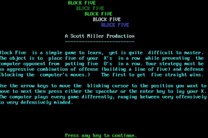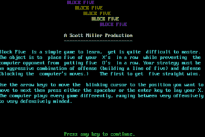 Released in 1986, Block Five is a strategic puzzle game that challenges players to arrange blocks in specific configurations. The game’s mechanics are straightforward yet engaging, offering a cerebral experience centered around spatial reasoning and quick thinking. It’s characterized by its simple graphics that were typical of its era but complemented by addictive gameplay that has captivated puzzle enthusiasts.
