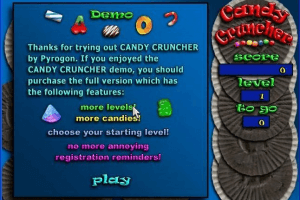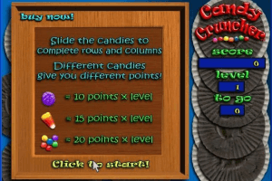 ‘Candy Cruncher’ is an engaging puzzle game developed by Pyrogon, Inc. and released in 2001. The game challenges players to strategically align candies in rows and columns to clear them from the board. Players must think several moves ahead to maximize their scores and progress through increasingly difficult levels.