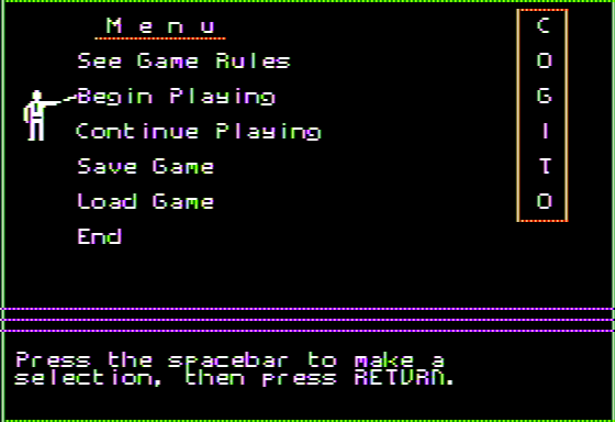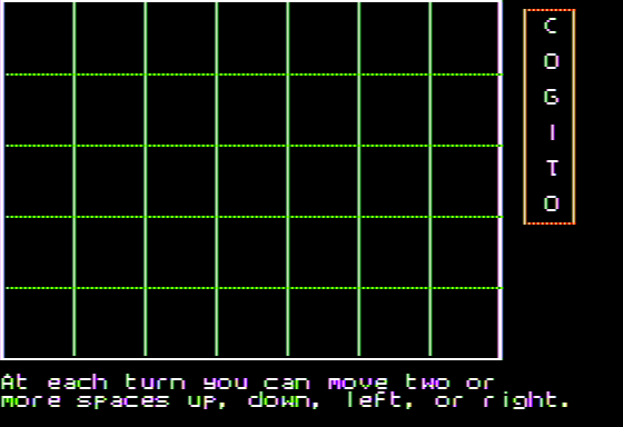 Cogito! is a lesser-known puzzle and strategy video game that was released in 1984. The game challenges players to engage their cognitive skills by solving complex puzzles to advance through various levels.