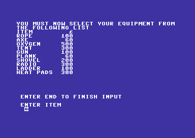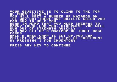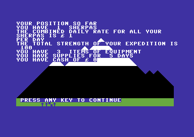 Released in 1984, this game was developed by Richard Shepherd Software Ltd. It is a classic example of an early text-based simulation and strategy game. Set against the daunting backdrop of Mount Everest, players attempt to manage a successful ascent to the iconic summit.