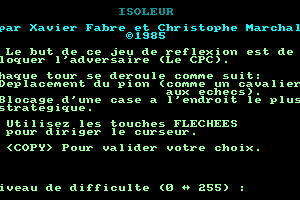 I’m sorry, but I don’t have any information about a game titled “Isoleur” released in 1985 developed by “Sprites”. It might be an obscure or niche title, or possibly a fictional or hypothetical scenario. Please check any spelling or detail, or ask about another topic.
