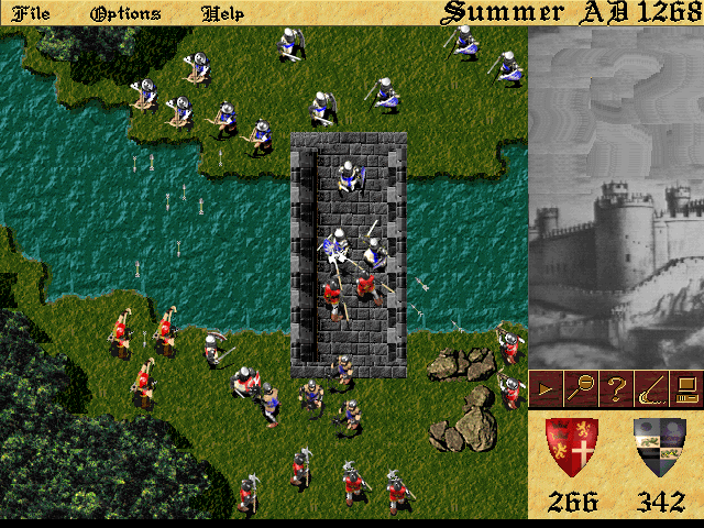 The game features a mix of strategy elements where players must balance the economic aspects of managing their realm with the military campaigns essential for expanding their territories. Each turn represents one season of the year, and players must make critical decisions regarding farming, castle construction, and troop movements. The ultimate objective is to outmaneuver opponents, both AI-controlled and human, in multi-player mode to achieve dominance.