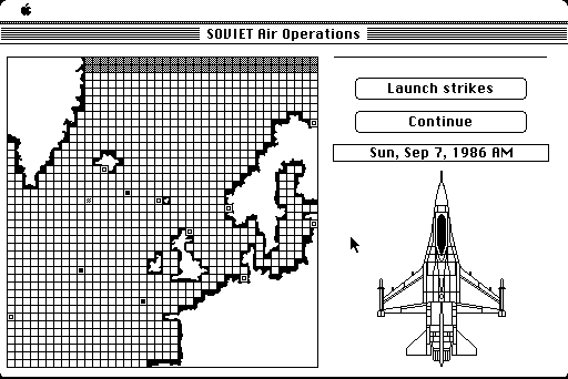 The graphics, typical of late ’80s titles, present a functional top-down view that prioritizes gameplay clarity and tactical information. Despite the limited color palette, the visual design effectively conveys the cold, calculated nature of military strategy.