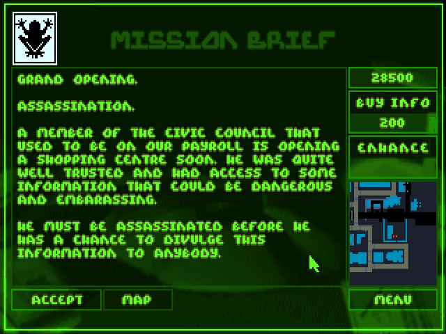 Players guide a group of cybernetically enhanced agents in real-time tactical missions. The objective is to complete various tasks while coping with obstacles and managing resources like weapons and equipment. The game incorporates strategic elements, as players must plan their approach carefully to succeed.