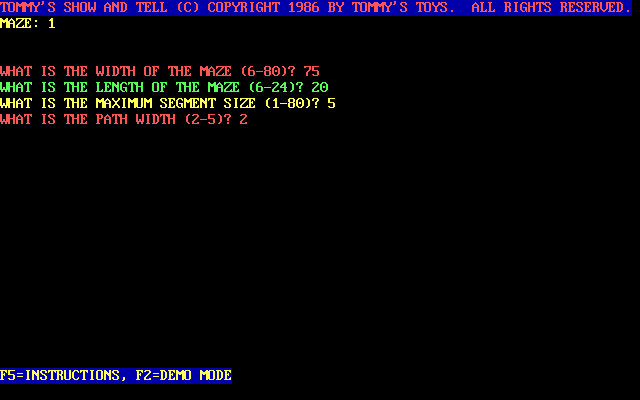 Released in 1986 by Tommy’s Toys, this game offers a classic maze generation experience. Designed for computer systems of the time, it combines simplicity with the challenge of navigating intricate mazes.