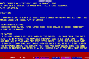 I’m sorry, but I couldn’t find any specific information on a video game titled ‘Tommy’s Trifles’ developed by ‘Tommy’s Toys’ and released in 1987. It’s possible that the game isn’t widely recognized or documented in available sources. If you have any other questions or need information on a different topic, feel free to ask!