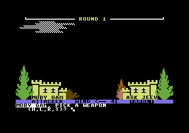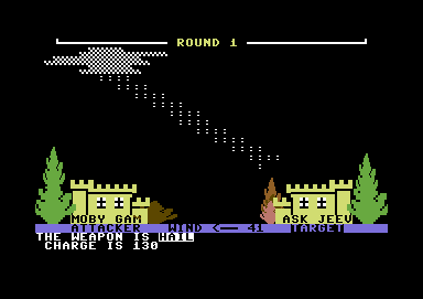 In this early computer game, players engage in a strategic battle using weather phenomena as their primary tools. The objective is to tactically position weather elements to outmaneuver and weaken the opposing player. The game employs a simple yet intriguing interface, allowing users to interact with various weather patterns and conditions.