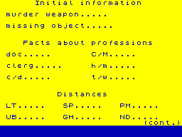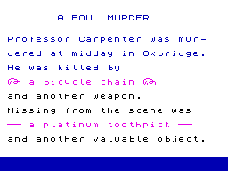 The game employs a text-based interface where players input commands to navigate through the interactive story. Players might encounter a series of prompts that describe locations, characters, and potential evidence. The goal is to piece together the narrative and solve the mystery through logical deduction. The absence of graphics means the game relies on well-written descriptions to immerse players in its atmospheric setting.
